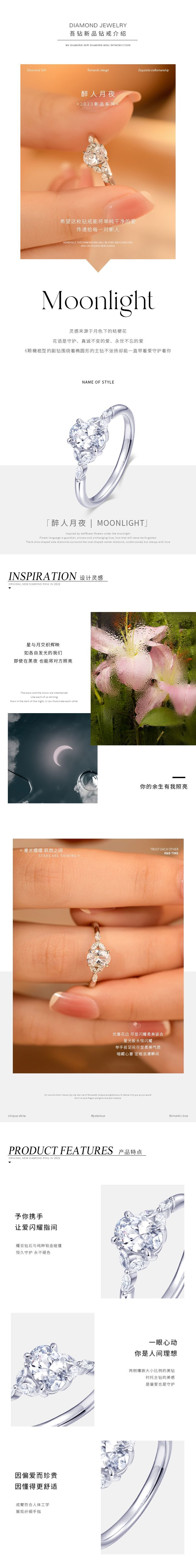 灵感来源于月色下的桔梗花花语是守护、真诚不变的爱、永世不忘的爱6颗橄榄型的副钻围绕着椭圆形的主钻不张扬,却能一直带着爱守护着你