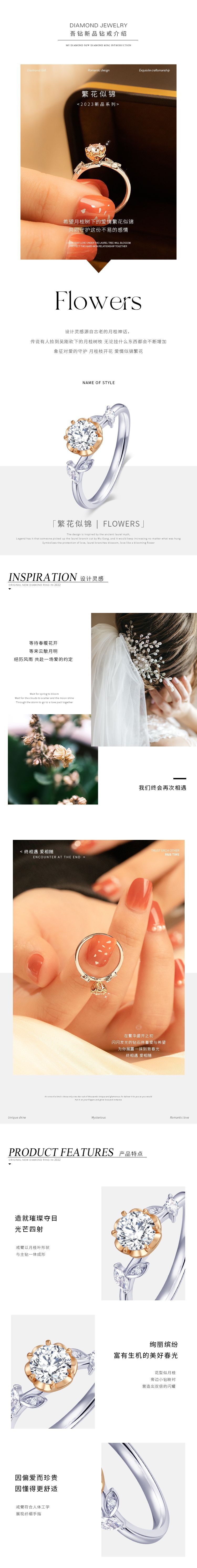 设计灵感源自古老的月桂神话,传说有人捡到吴刚砍下的月桂树枝,无论挂什么东西都会不断增加。戒臂以月桂叶形状,与主钻一体成形,象征对爱的守护;月桂枝丫开花,爱情似锦繁花